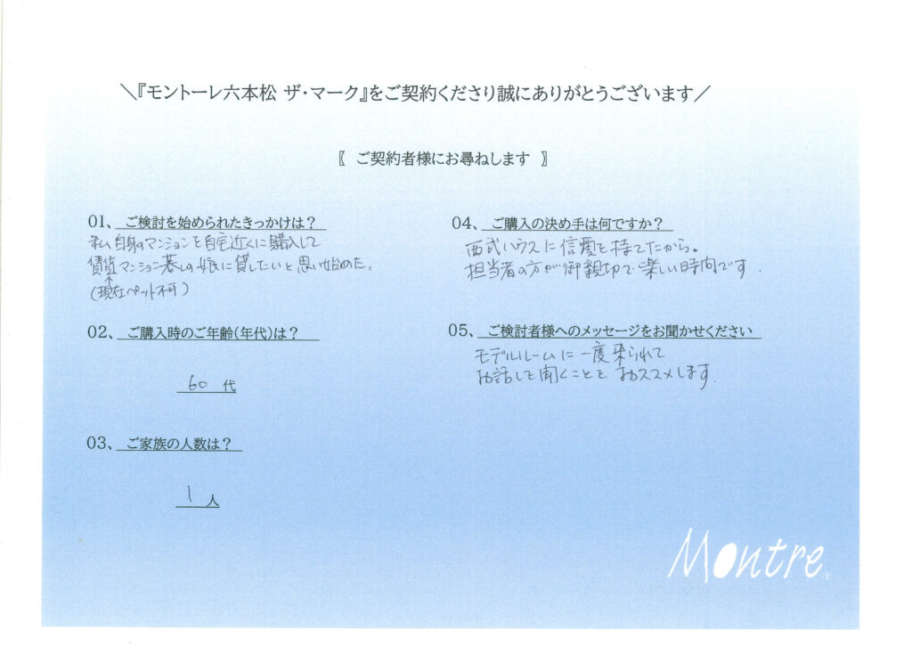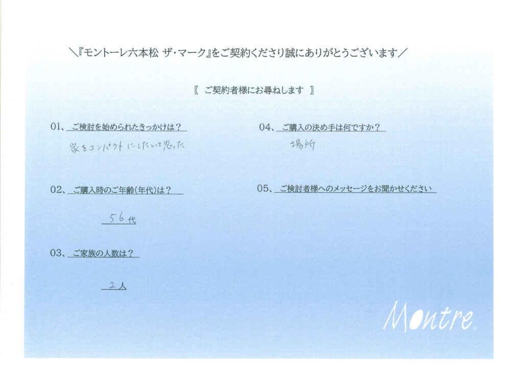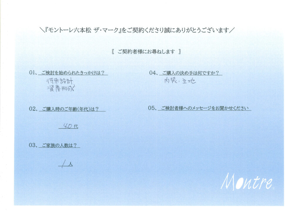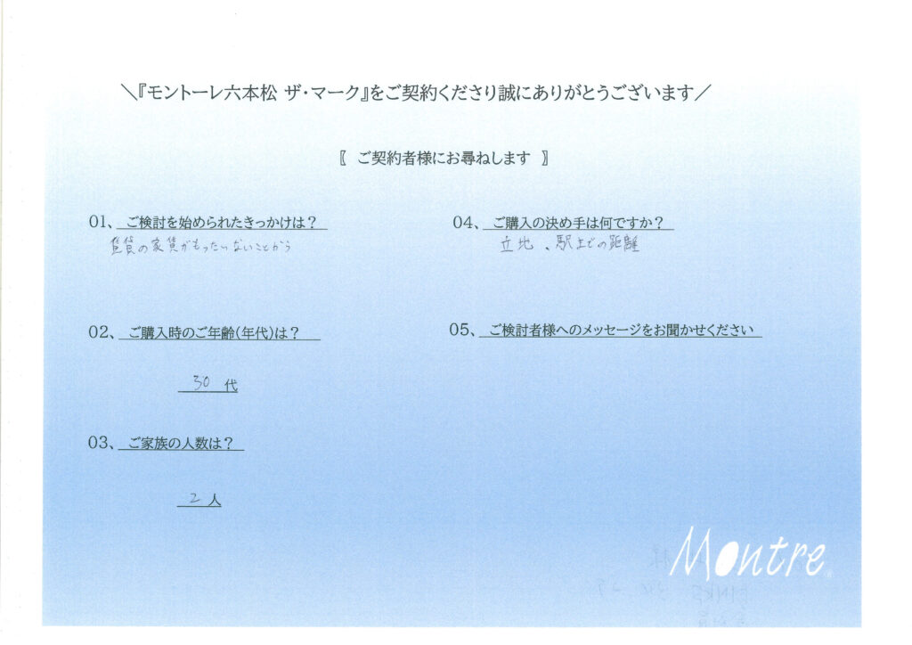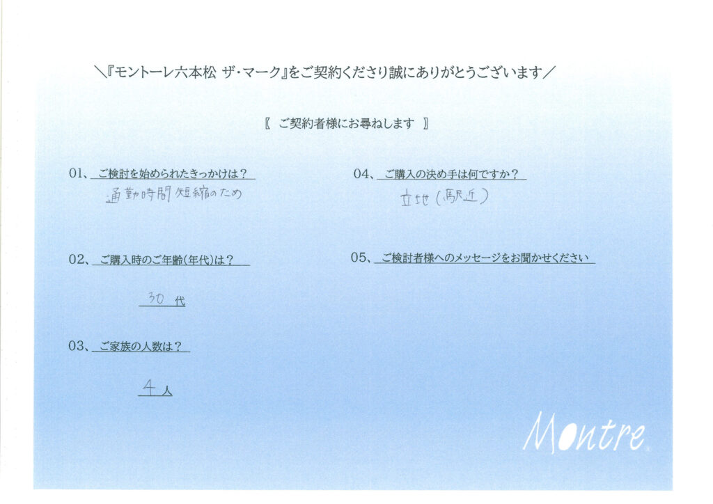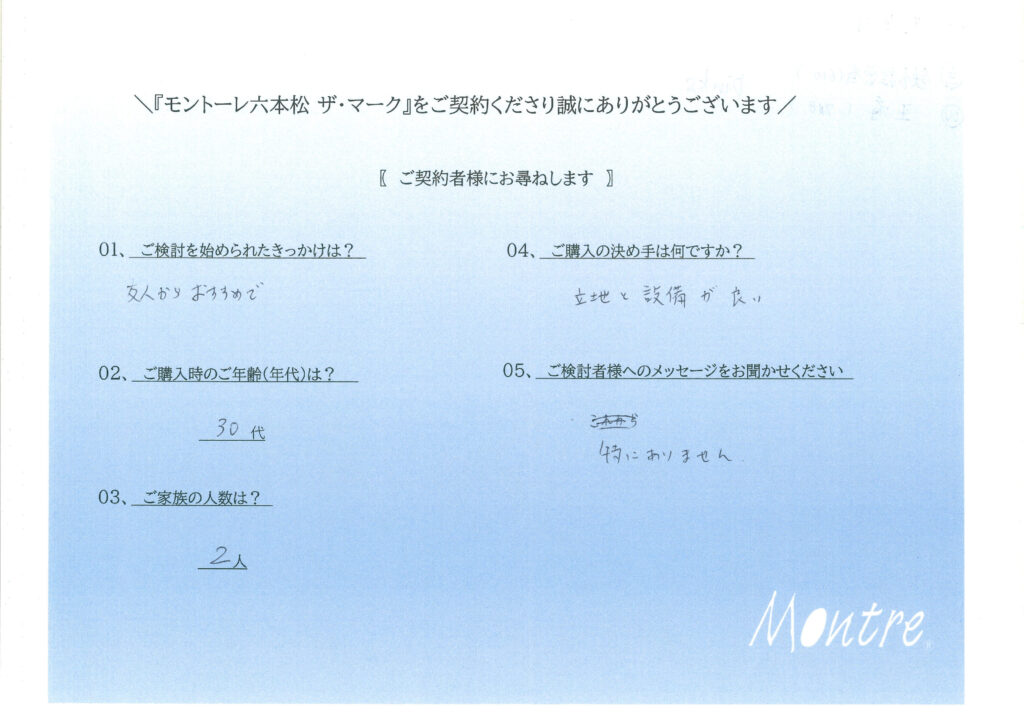 ご契約いただきましたお客様よりアンケートをご回答いただきました。